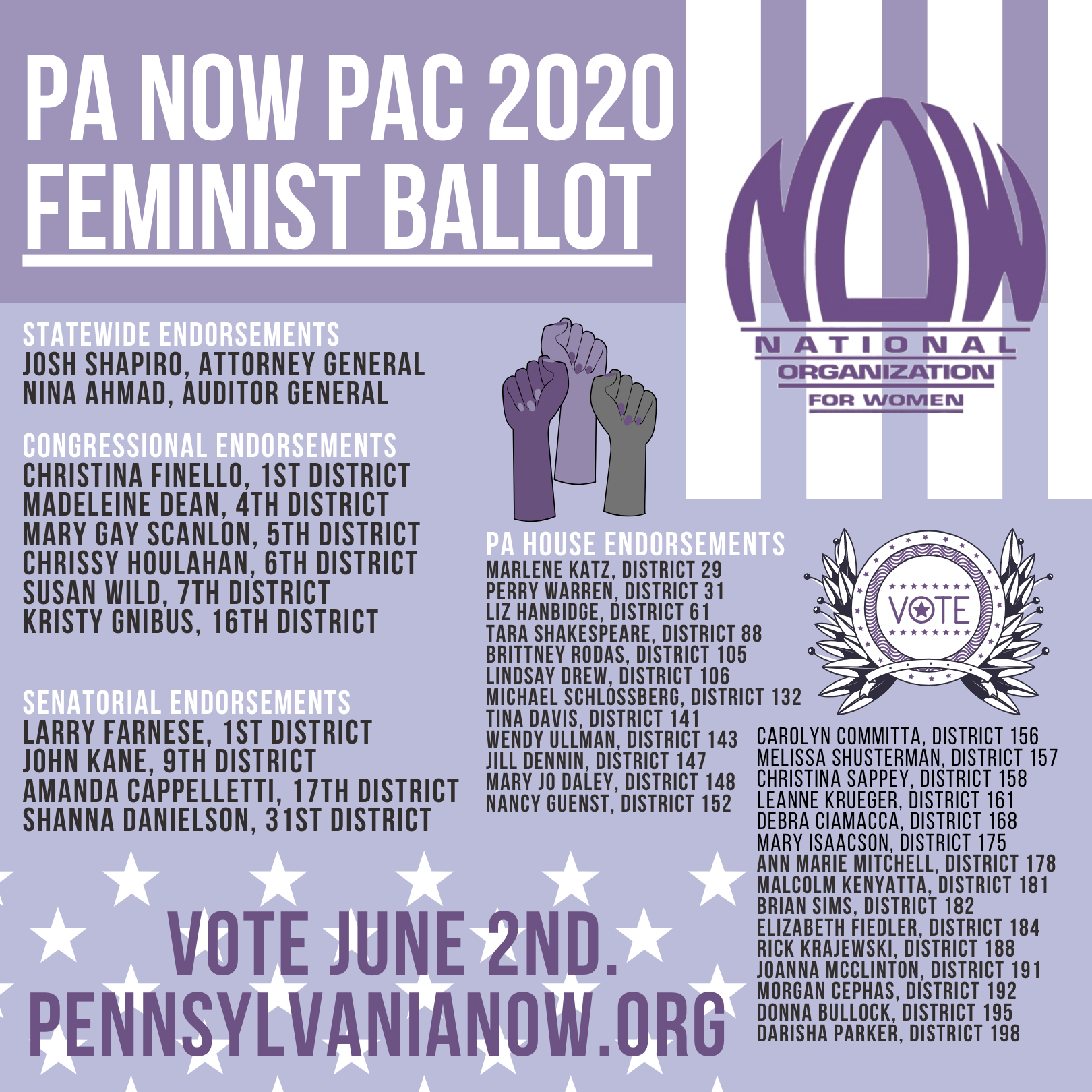Our PAC happily supports each of the candidates on our 2020 Primary Feminist Ballot and we are proud of their commitments to advocating on behalf of our mission and supporting the communities we serve.PA NOW is especially proud to endorse one of our former NOW Chapter Presidents and National Board Member, Nina Ahmad for Auditor General. Make certain to vote for these candidates and move PA forward NOW!