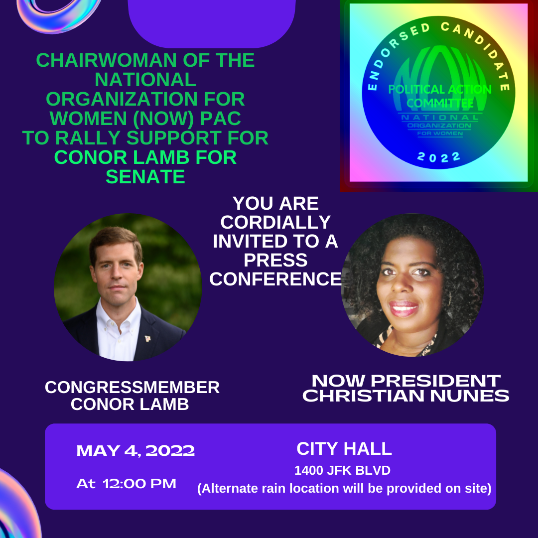 You are cordially invited to attend a press conference hosted by the Pennsylvania Chapter of the National Organization for Women featuring NOW President Christian Nunes to rally support for Congressmember Conor Lamb. Date: Wednesday, May 4, 2022Time: 12:00PMLocation: Philadelphia City Hall1400 JFK Boulevard Philadelphia, PA 19107 (Alternate rain location will be provided on-site.)